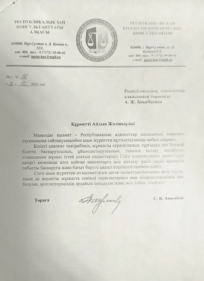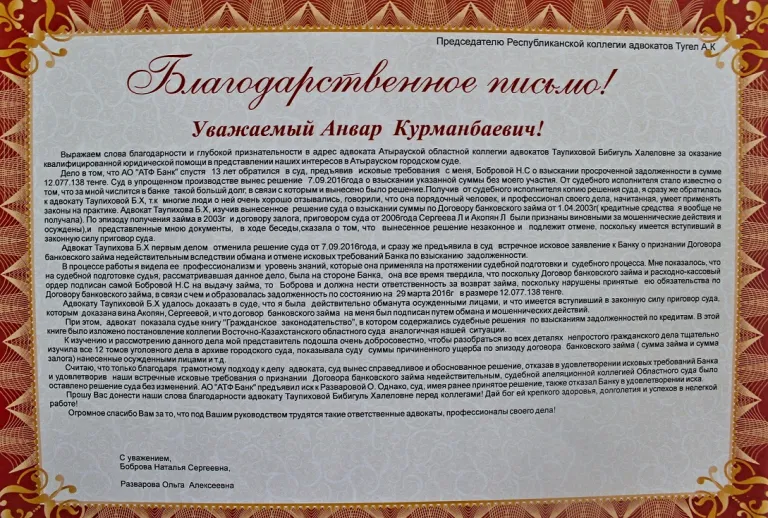 Благодарность в адрес адвоката Атырауской областной коллегии адвокатов Бибигуль Таупиховой