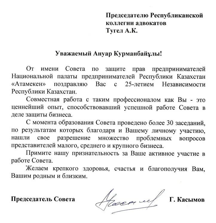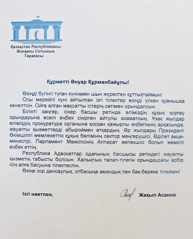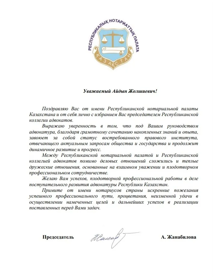 ПОЗДРАВЛЕНИЕ ОТ РЕСПУБЛИКАНСКОЙ НОТАРИАЛЬНОЙ ПАЛАТЫ КАЗАХСТАНА