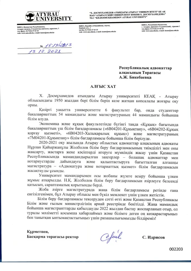 Х.ДОСМҰХАМЕДОВ АТЫНДАҒЫ АТЫРАУ УНИВЕРСИТЕТІ» АТЫНАН АЛҒЫС ХАТ