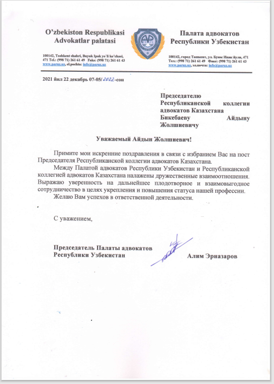ПОЗДРАВЛЕНИЕ ОТ ПАЛАТЫ АДВОКАТОВ РЕСПУБЛИКИ УЗБЕКИСТАН