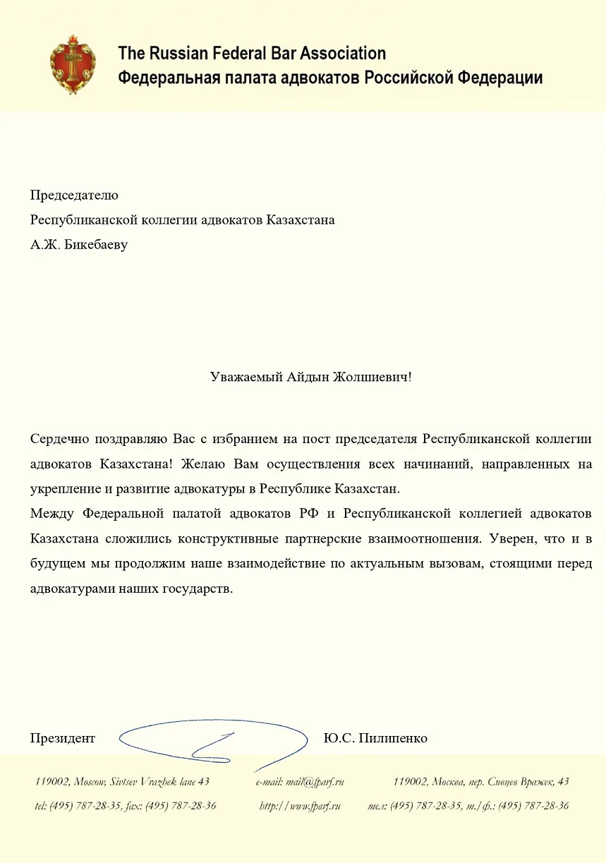 ПОЗДРАВЛЕНИЕ ОТ ФЕДЕРАЛЬНОЙ ПАЛАТЫ АДВОКАТОВ РФ